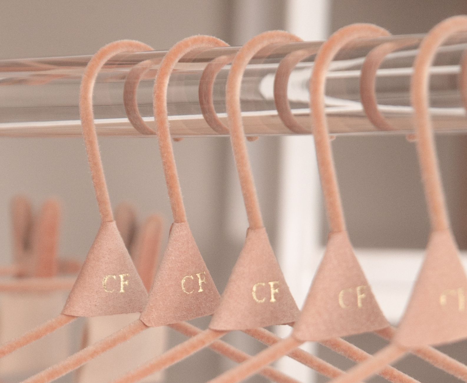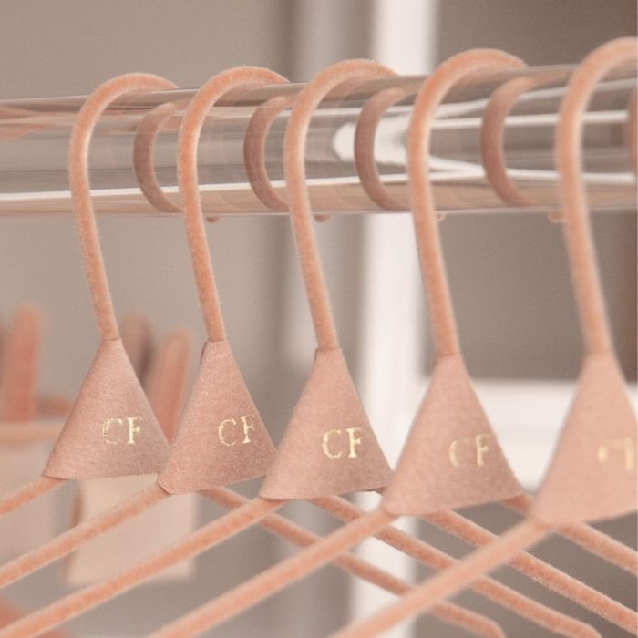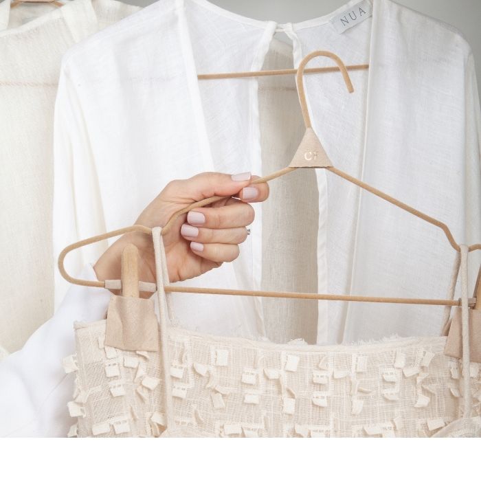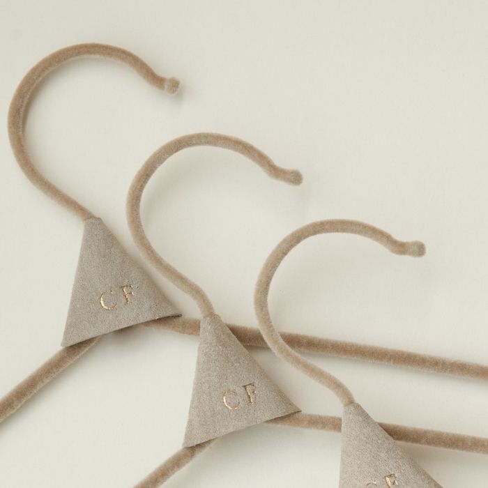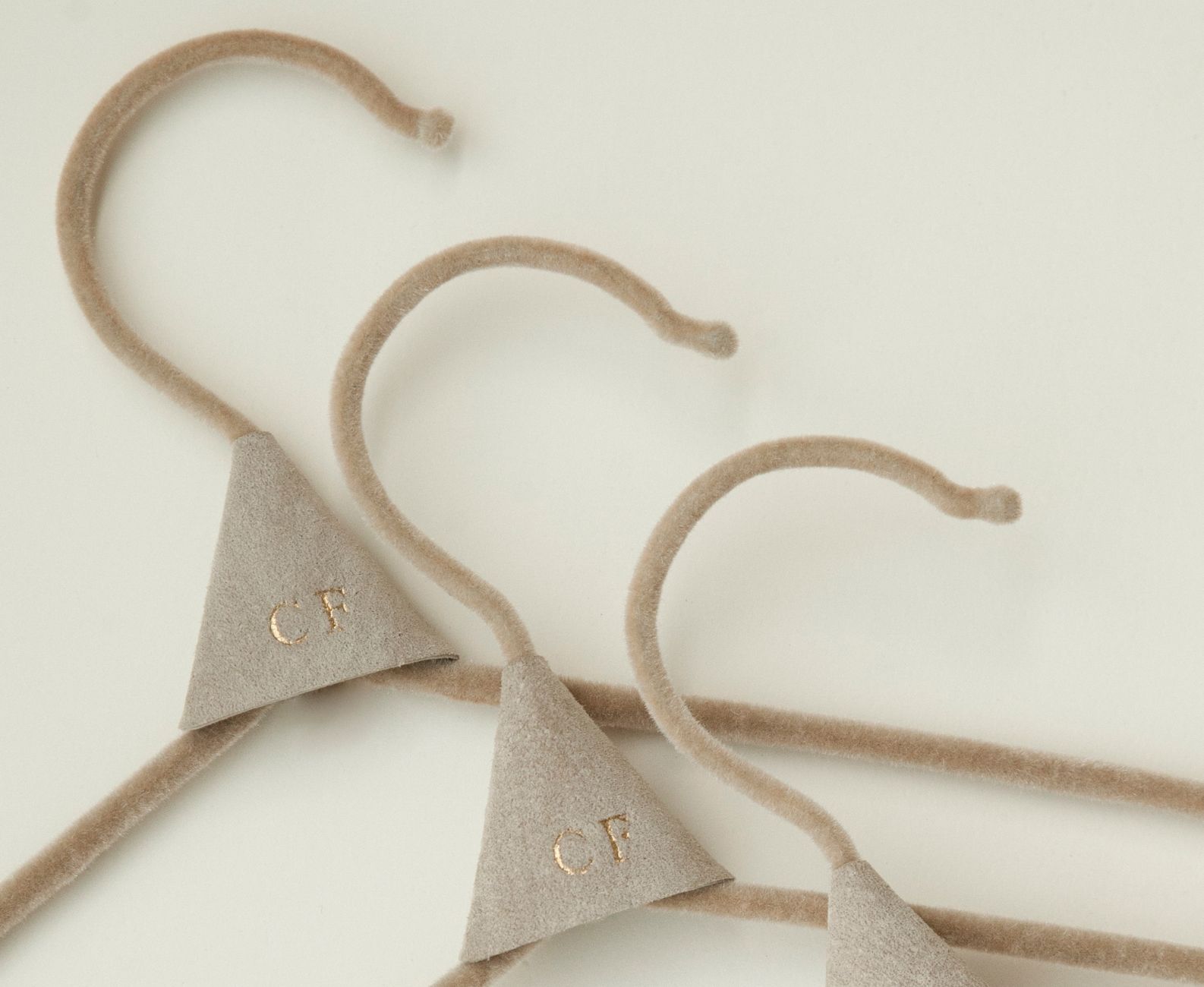 Nossos Cabides são produzidos por um processo minucioso e artesanal de flocagem, realizado em 2 etapas: parte inferior e parte superior. O acabamento em couro no gancho permite personalizar com um monograma (2 letras). Este modelo com Cava e Presilhas foi desenhado para pendurar conjuntos com blusas de alcinhas e saias ou calças.