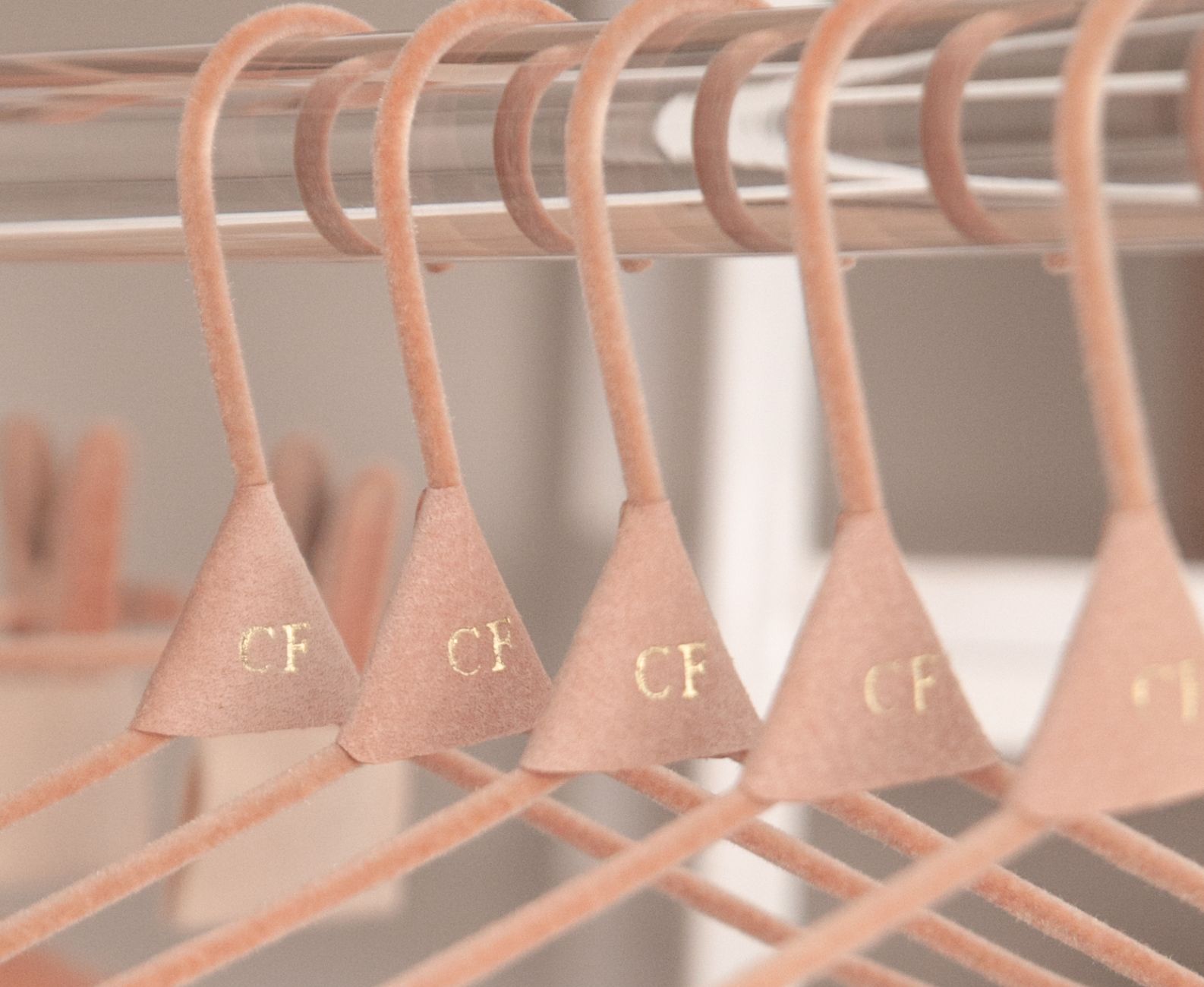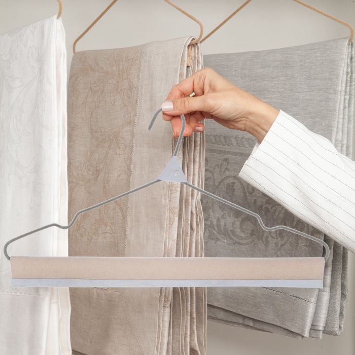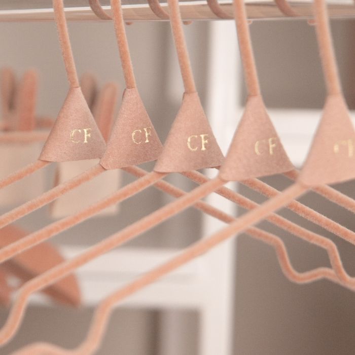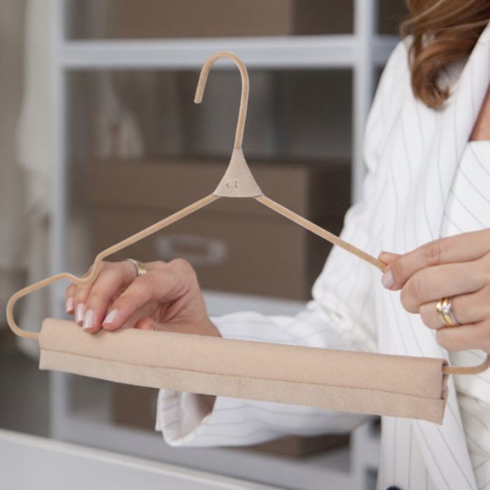 Nossos Cabides são produzidos por um processo minucioso e artesanal de flocagem, realizado em 2 etapas: parte inferior e parte superior. O acabamento em couro no gancho permite personalizar com um monograma (2 letras). Este modelo com Tira Vinco é ideal para pendurar conjuntos com blusas de alcinhas e calças alfaiataria.